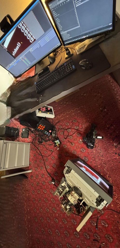 Mein Sony PVM-20M4E zeigte seit einigen Wochen einen extremes Farbbluten auf der Farbe Rot. Zuerst habe ich in den Chroma Settings Rot auf MIN gestellt aber so richtig zufrieden war ich dann doch nicht. Im Urlaub über Weihnachten habe ich dann nachts um 2 angefangen das Problem zu untersuchen. Also erst mal den fetten Kasten vom Strom nemen und das Gehäuse abschrauben. Um in Echtzeit ein Bild zu sehen habe ich meine geliebte Sony PD170 an meinen Ryzen7 PC über eine CaptureCard + RetroTink Upscaler angeschlossen. In OBS konnte ich dann live sehen was vorne am Bild passiert wenn ich hinten die feinen Rädchen drehe.
